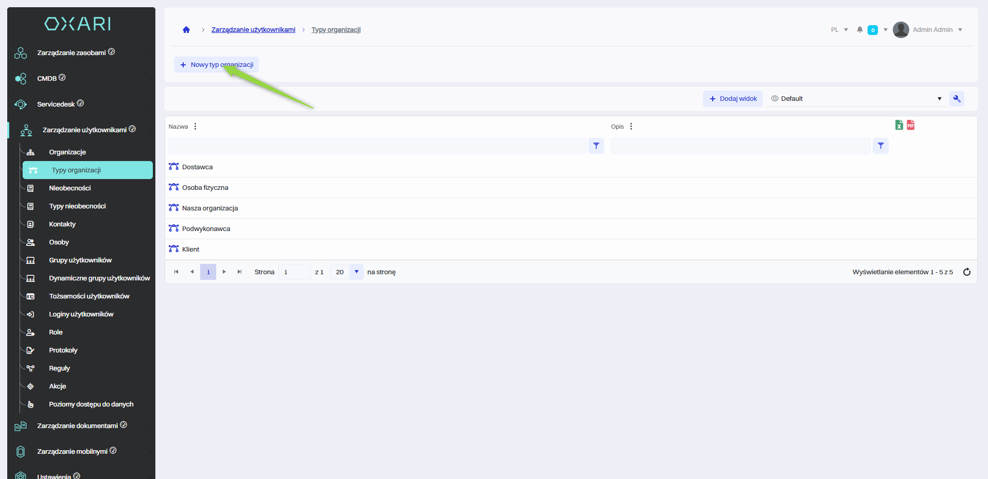 W systemie Oxari sekcja "Typy organizacji" pozwala na kategoryzację podmiotów według ich funkcji biznesowej. Standardowe kategorie to: Dostawca, Osoba fizyczna, Własna firma, Podwykonawca i Klient. System oferuje elastyczność, umożliwiając również definiowanie dodatkowych, spersonalizowanych typów organizacji. Typów organizacji używa się przy dodawaniu nowej organizacji w sekcji Zarządzanie użytkownikami > Organizacje.