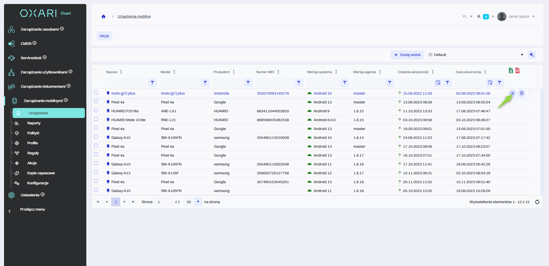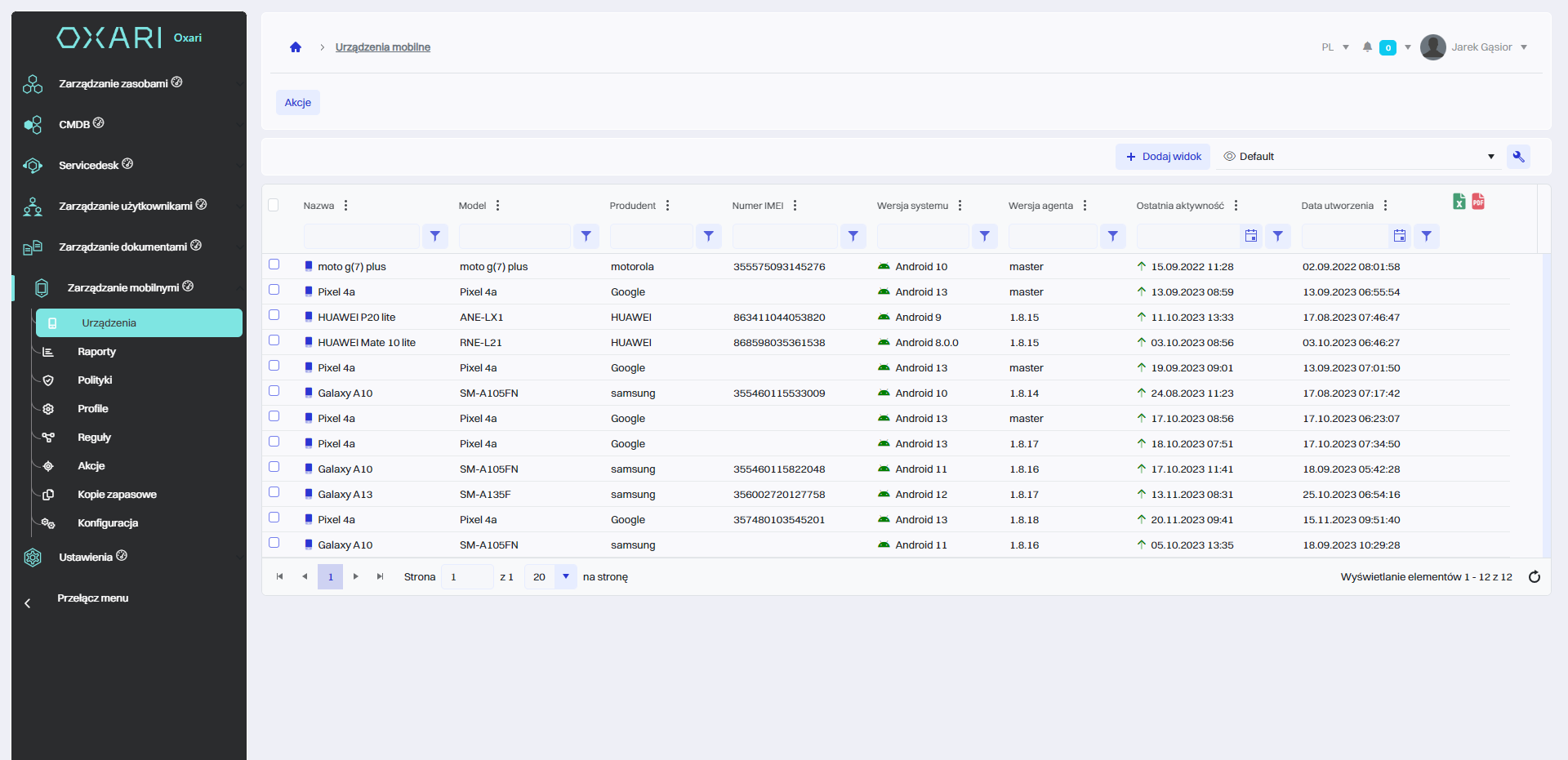 W głównym oknie znajduje się tabela z listą urządzeń z zainstalowanym agentem, która zawiera szczegółowe informacje takie jak nazwa, model, producent, numer IMEI oraz wersja agenta dla każdego urządzenia.