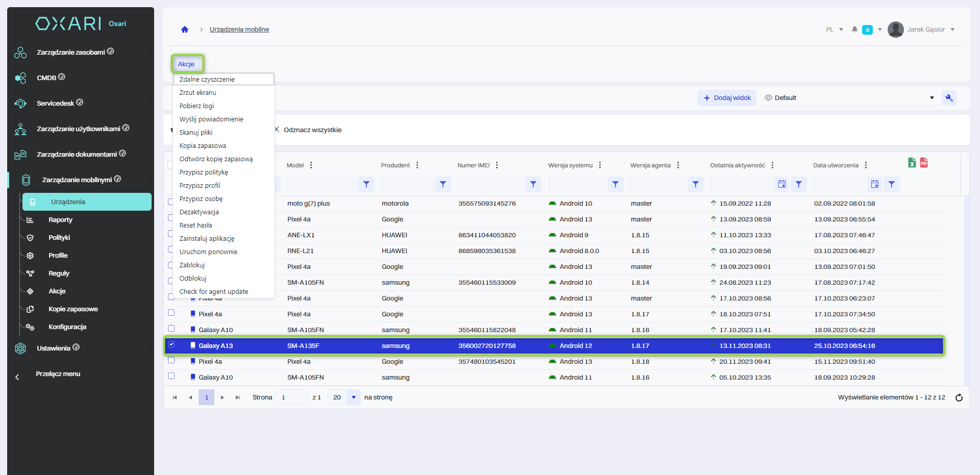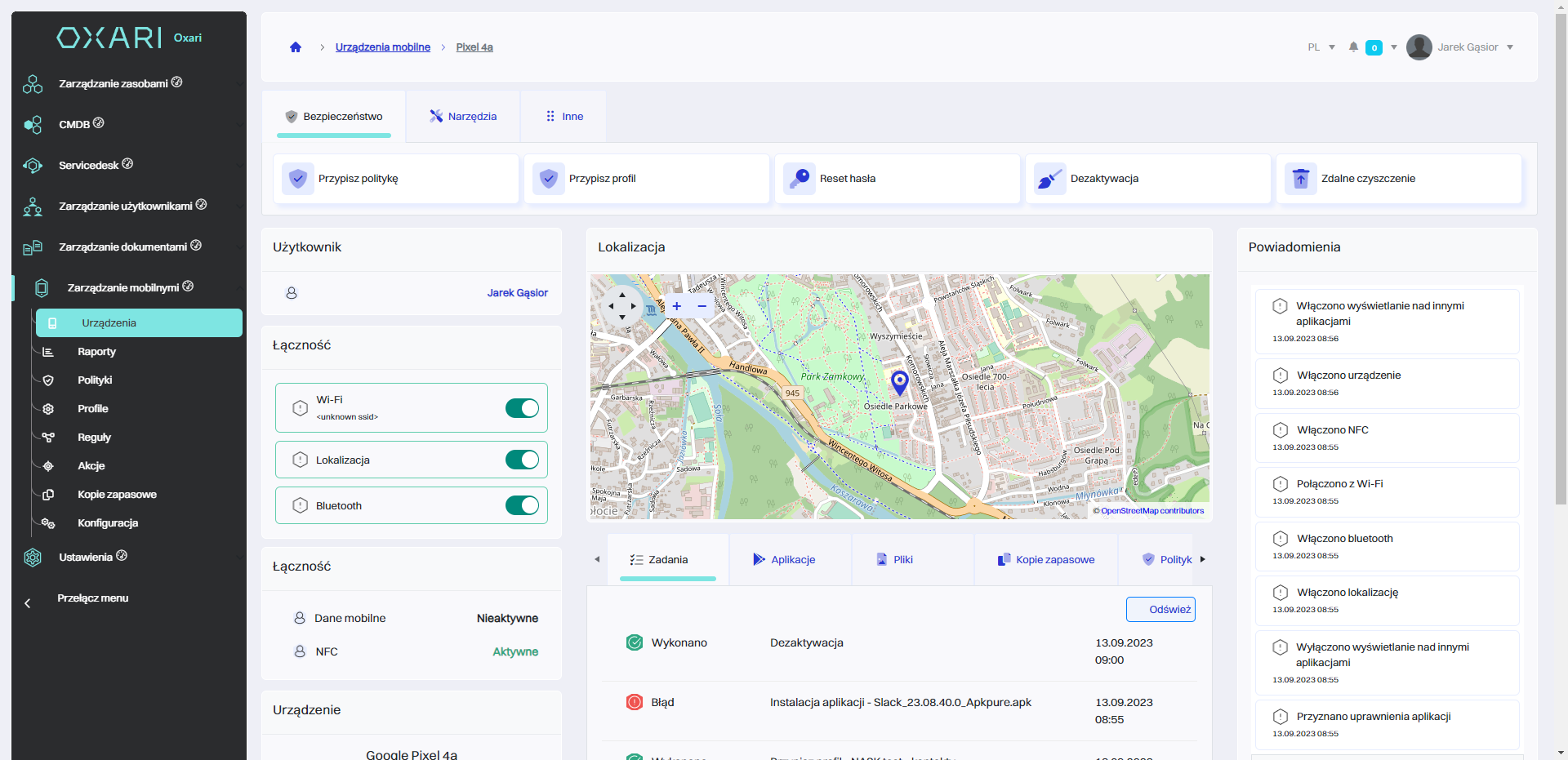 Poniżej interfejs systemu zarządzania urządzeniami mobilnymi OXARI, skoncentrowany na szczegółach konkretnego urządzenia. Ekran podzielony jest na kilka sekcji, które umożliwiają zarządzanie różnymi aspektami urządzenia.