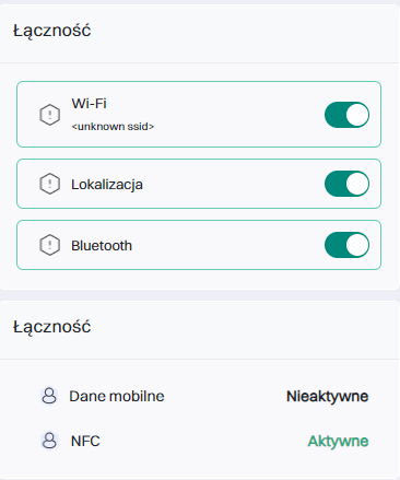 Łączność zawiera informacje o rodzaju komunikacji uruchomionej na urządzeniu.