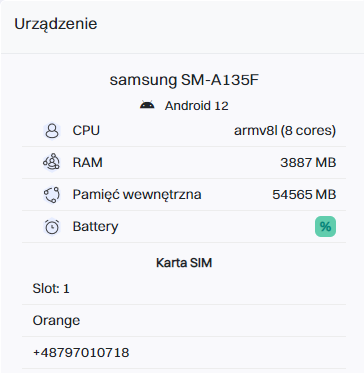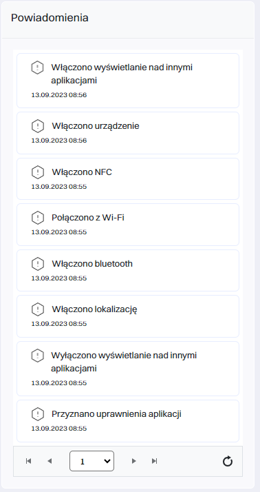 Sekcja ta pokazuje listę zdarzeń i zmian stanu związanych z urządzeniem mobilnym. Każde powiadomienie jest oznaczone czasem, kiedy miało miejsce, co pozwala na śledzenie ostatnich aktywności urządzenia.