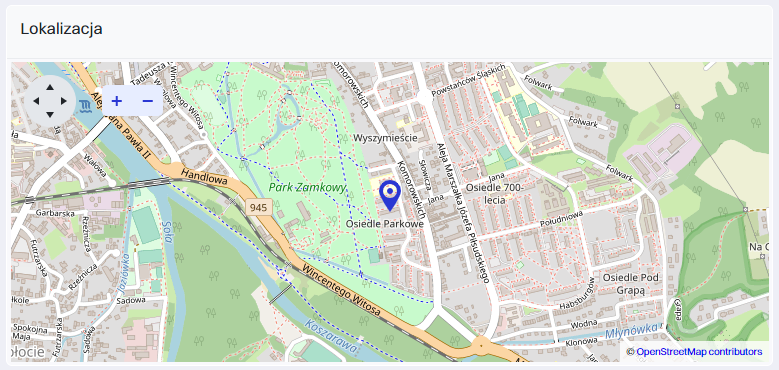Sekcja pokazuje mapę, na której jest wskazana aktualna lokalizacja urządzenia.