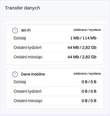 Sekcja ta przedstawia informacje o użyciu danych przez urządzenie. Pokazuje ona ilość danych otrzymanych (pobranych) i wysłanych dla dwóch różnych typów połączeń: Wi-Fi i dane mobilne.