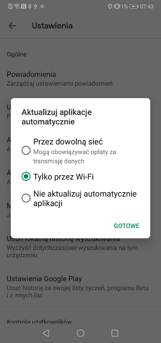 Określić preferowaną opcję aktualizacji, rekomendowaną jest opcja "Tylko przez Wi-Fi" w celu uniknięcia zużywania danych komórkowych. Potwierdzić wybór, klikając "Gotowe".
