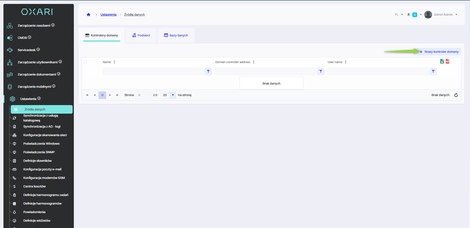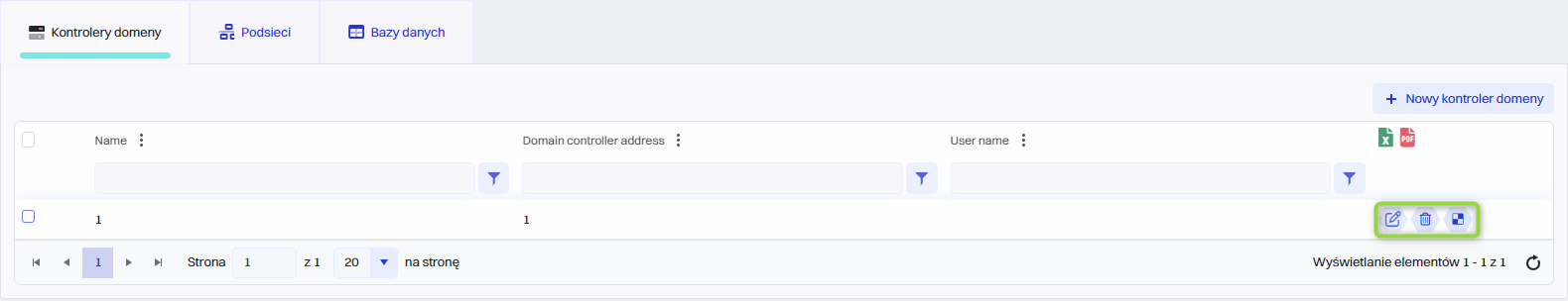 Kontroler domeny należy dodać w celu wykonania synchronizacji z usługą katalogową. W celu dodania nowego kontrolera domeny należy przejść do sekcji kliknąć przycisk “Nowy kontroler domeny”.