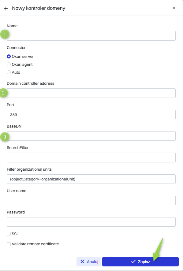| 3 | BaseDN - (Base Distinguished Name) Odnosi się do punktu startowego w hierarchii LDAP, od którego system OXARI rozpoczyna przeszukiwanie danych. |