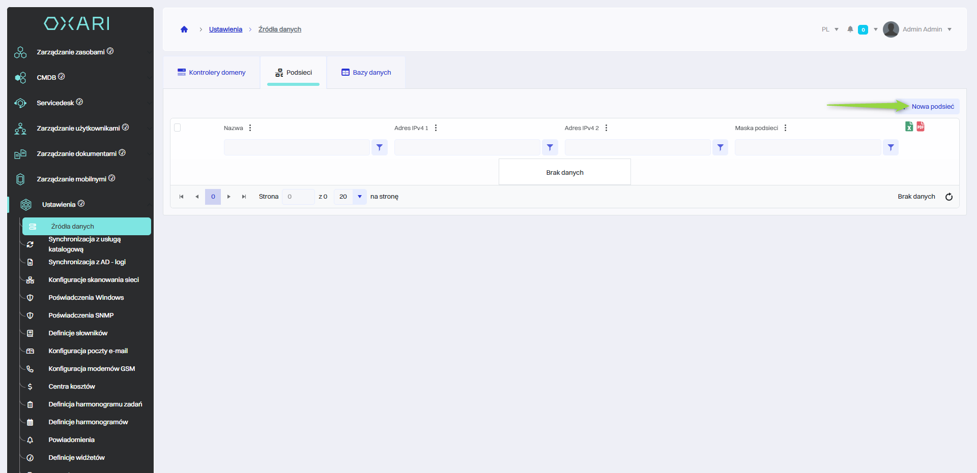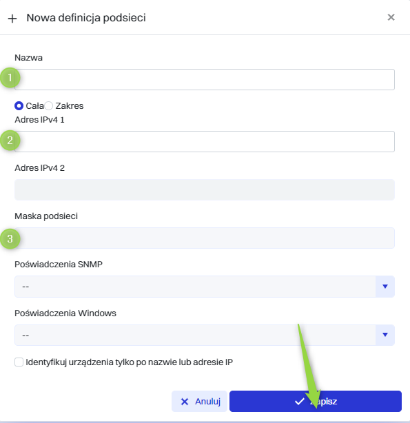 Definicje podsieci pozwalają podać podsieci, które mają zostać objęte skanowaniem. W celu dodania nowej definicji podsieci należy przejść do sekcji kliknąć przycisk “Nowa podsieć”.