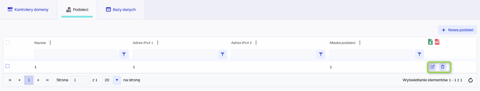Podsieć może być edytowana lub usunięta przy użyciu następujących przycisków.