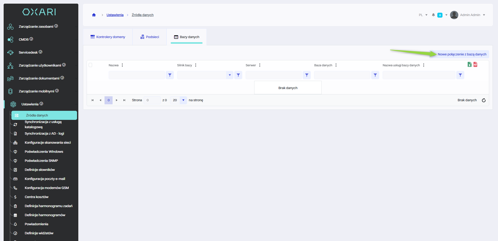 W celu dodania nowego połączenia z bazą danych, należy kliknąć przycisk “Nowe połączenie z bazą danych”.