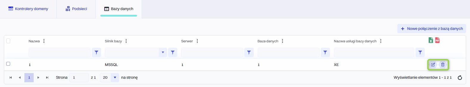 Połączenie z bazą danych może być edytowane lub usunięte przy użyciu następujących przycisków.