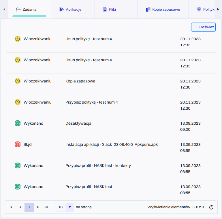 Tasks - This tab shows a list of tasks assigned to the device. Tasks can be in different states: “expected”, “Executed”, “Błąd”, etc., and include a variety of shares such as application installation, update, backup copy creation.