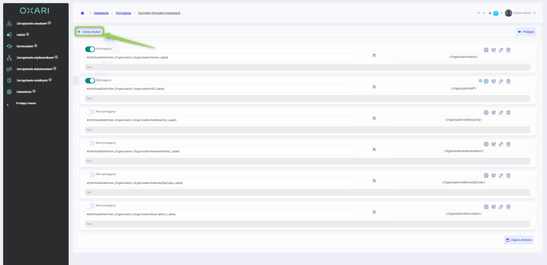 Setting visibility conditions for individual attributes according to the organization's needs is possible through the Required/Not Required sliders. To change the visibility condition for an attribute, click on the desired slider.