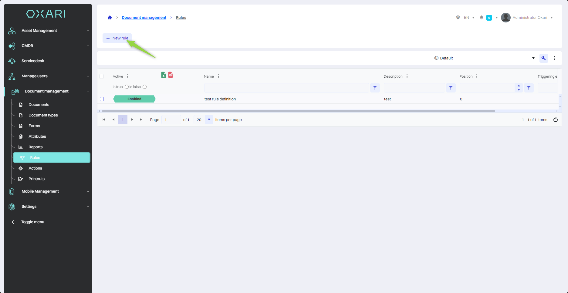 To add a new rule, go to Document Management > Rules, and then click the "New Rule" button.