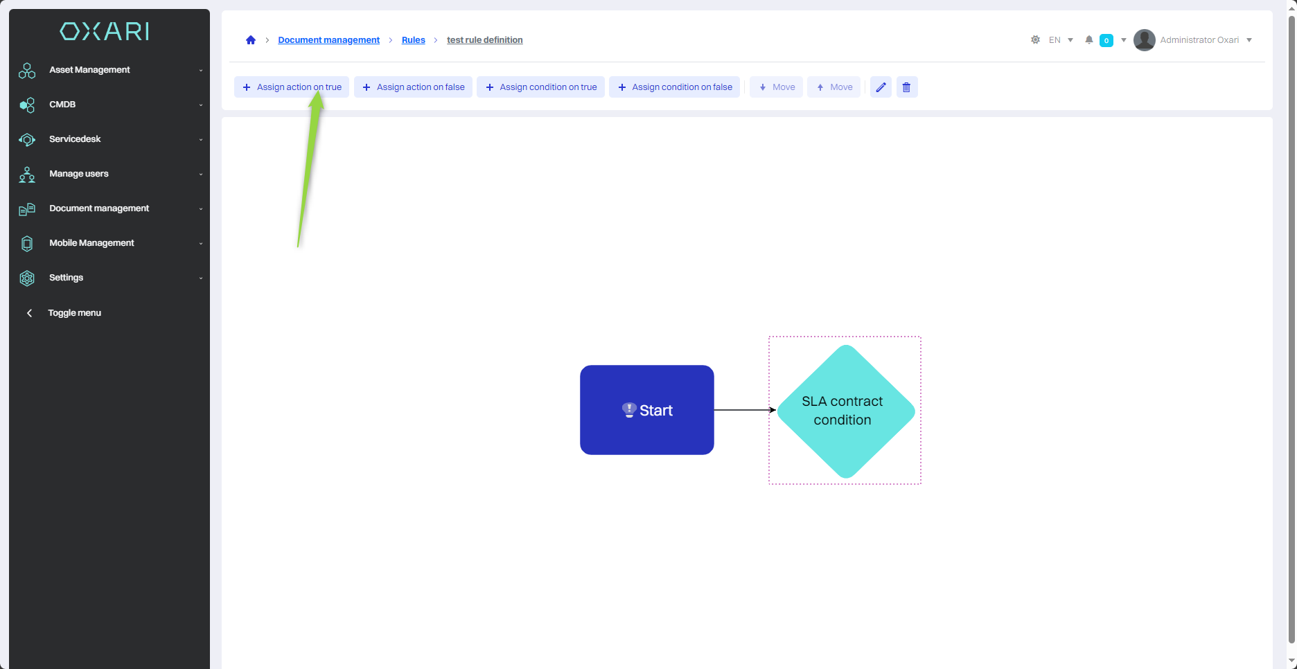 In the example in question, when the condition of the "SLA" document type is met, to assign an action to it, click on the "Condition for SLA" tile and then select the "Assign action for TRUE" option.