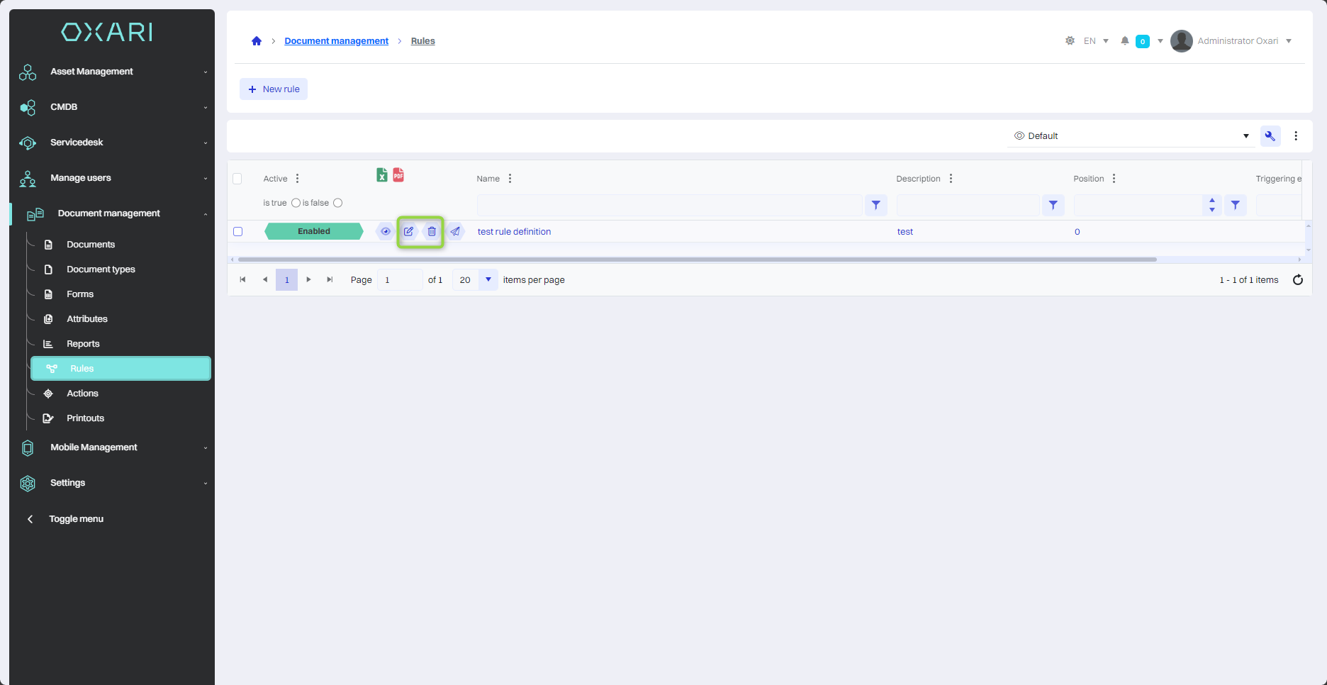 Each rule can be activated or deactivated. To activate/deactivate a rule, go to Document Management > Rules. Hover over the desired rule and click the edit button.